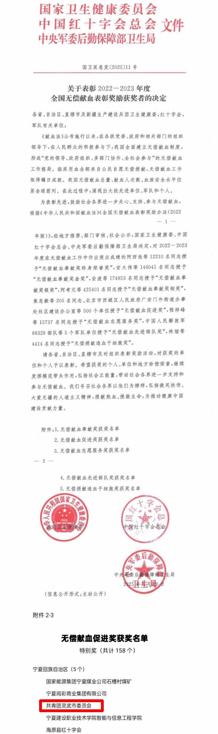 近日,國家衛(wèi)生健康委、中國紅十字會(huì)總會(huì)、中央軍委后勤保障部衛(wèi)生局聯(lián)合發(fā)布《關(guān)于表彰2022—2023年度全國無償獻(xiàn)血表彰獎(jiǎng)勵(lì)獲獎(jiǎng)?wù)叩臎Q定》,靈武團(tuán)市委榮獲“2022—2023年度全國無償獻(xiàn)血促進(jìn)獎(jiǎng)特別獎(jiǎng)”。